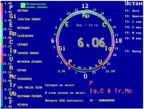 Автор отдает себе отчет в том, что не все читатели настолько увлечены исследованиями биоэнергетики организма человека, что будут держать в памяти все тонкости применения древнего целительского постулата. Поэтом фирмой "Алмедио" предложен карманный прибор, позволяющий при вводе даты рождения, города проживания и названия биологической активной добавки получить ответ о времени ее оптимального приема.