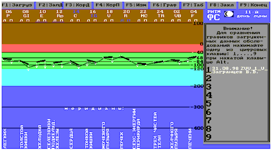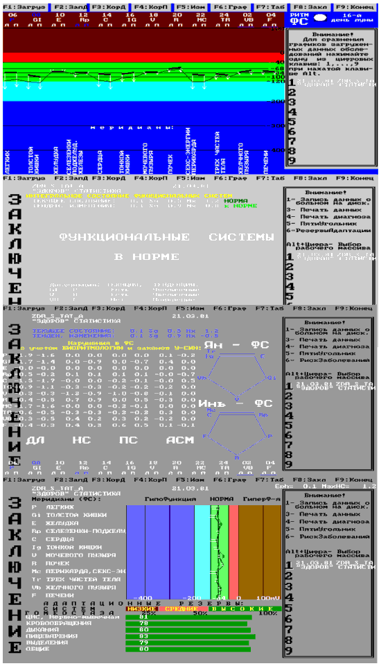 Статистическая ЭПГ "ЗДОРОВ" для курсантов ВМедА (средний возраст 25 лет) убедительно доказывает, что ЗДОРОВЬЕ нам только снится. Во-первых, она не удовлетворяет одному из важнейших положений древневосточной медицины: в здоровом организме ЯН-ские ФС должны иметь более высокий энергетический потенциал по сравнению со своими ИНЬ-ФС синергистами, в силу чего имеем три дисфункции (Gi – P, V – R, Vb – F). Во-вторых, она не удовлетворяет установленному экспериментально требованию: энергетическая активность дневных ФС должна преобладать над активностью ночных ФС (в нашем случае: – 85,14 мВ и – 80,30 мВ соответственно). Иначе говоря, статистическая ЭПГ "ЗДОРОВ" доказывает, что в наше время ЗДОРОВЫХ людей НЕТ. Все практически здоровые находятся в состоянии ПРЕДБОЛЕЗНИ. В дальнейшем к 1995 году, когда БАНК ДАННЫХ у нас существенно расширился (более 10.000 исследований), и эти выводы подтвердились.