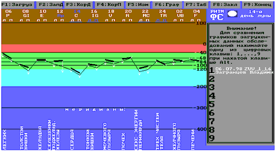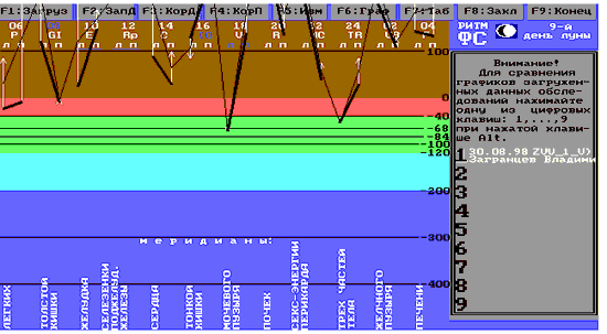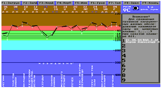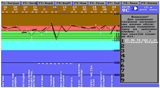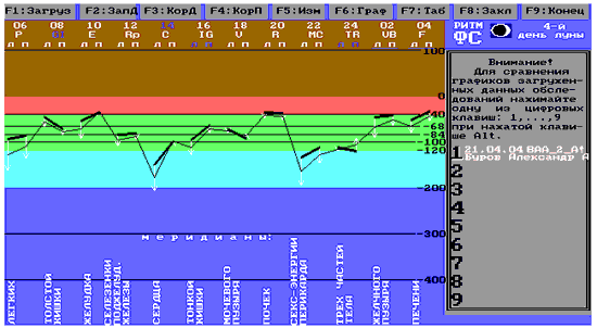 Читатель обрати внимание на вышестоящую таблицу. Если характеристики электродов, которыми выполняется съем данных с биологических активных точек, имеют более высокие электрические характеристики, во время измерений происходит одновременный электромассаж. То есть повторные измерения невозможны из-за возникающих искажений. Сравнительные характеристики представлены в последней колонке. Наконец, если данные измерений не увязаны с 60-ти летним календарем, солнечным и лунным ритмами, они не подлежат физиологической трактовке. С таким же успехом можно снимать показателя со стакана с водой и гадать о здоровье человека, который ее выпьет. Ни один из методов, кроме "Зодиака" такой увязки не имеет.