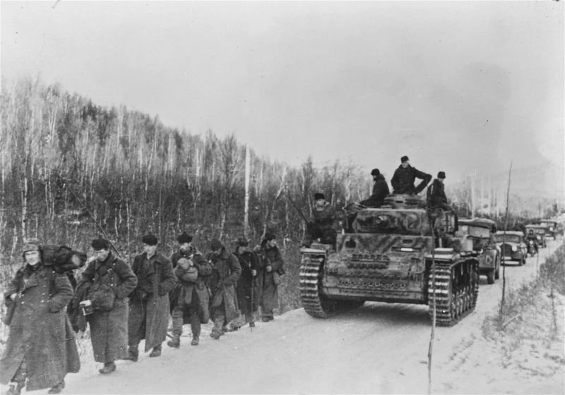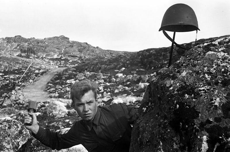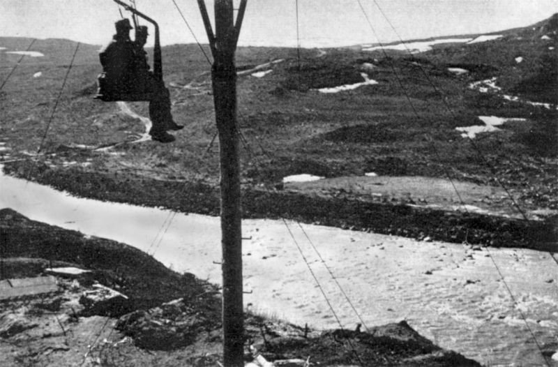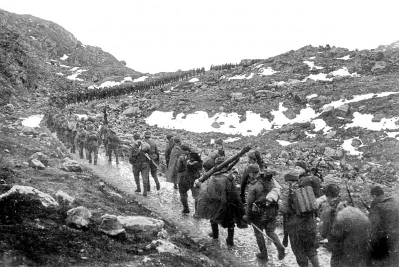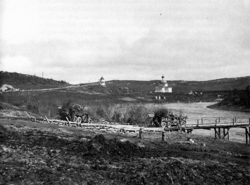 к сожалению существует не так много фотоматериалов довоенного периода по Кольскому полуострову и по дорогам в частности . и следующий блок фотографий относится ко второй мировой . они с оригинальными названиями и некоторые с моими комментариями 1. Морской пехотинец Северного флота в бою метает ручную гранату РГД-33 с оборонительной рубашкой, используя надетый на штык стальной шлем для обмана противника. Авторское название «Матросская уловка». 2. Колонна немецкой техники и советские военнопленные на дороге на севере Норвегии. На переднем плане танк Pz.Kpfw. III Ausf. N. те же древние дороги в норвегии 3. Немецкие горные егеря в каретке на одном из участков канатной подвесной дороги в районе высоты «Сердцевинная». очень показательная фотография . канатная дорога рядом с мощенной трассой уходящей вдаль по скалам . возникает резонный вопрос - зачем строить канатную дорогу для снабжения войск , если рядом проходит прекрасный тракт ? ответ прост - недостаточное количество транспорта и дефицит топлива . с обоих сторон для снабжения использовался в основном гужевой транспорт . и здесь мы имеем совершенно непонятную ситуацию для масс , назовем ее * кольский парадокс * . с одной стороны - разветвленная сеть мощеных дорог в арктике - с другой - отсутствие сколь нибудь значимых населенных пунктов и транспорта на начало 20 века и вплоть до 40 х годов но , уверен , лжецы - академики от РАН с легкостью обьяснят и это , своим культурно - умным птичьим языком . ни минуты в них не сомневаюсь . например что это всего лишь всеобщая оптическая иллюзия . 4. Бойцы 12-й Краснознаменной бригады морской пехоты Северного флота на марше через хребет Муста-Тунтури во время Петсамо-Киркенесской операции. 5. Немецкая техника на мосту города Петсамо (современное название — Печенга) в первый день наступления на Мурманск. - Сегодня