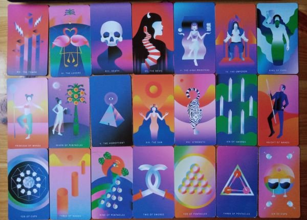 Сегодня забрала "Таро мистических понедельников". Колода стильная! Такой сочный минимализм! Купила по уценке за 120 гривень, так как есть брак: по торцу колоды растекся клей и многие карты слиплись. Их разъединили, но по краям остались потертости. Но для меня это не критично. Размер карт чуть меньше стандартных - 6 на 10 см. Картон тоже тонковат. Но я с первого взгляда влюбилась в картинки! Традиция - Райдер-Уэйт, но так вкусненько обыграна!