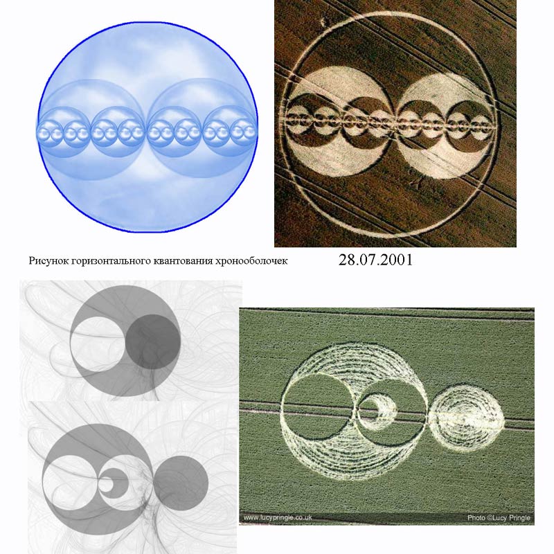 Как я уже говорила, одним из факторов, привлекшим мое внимание к кругам на полях, были знакомые картинки похожие на те, которыми я обычно изображаю квантование хронооболочек. Конечно, мои рисунки много проще, и это понятно, ведь у природы в этом плане гораздо больше возможностей. Но, тем не менее, я привела несколько одинаковых рисунков. Здесь показаны несколько таких соответствий, но на самом деле их намного больше. Увидев подобное сходство, интерес к кругам резко возрос. Кто или что создает эти фигуры, почему в них так много общего с изображением интегральной структуры мироздания? Понятно, что ответы надо искать в свойствах хронооболочек.